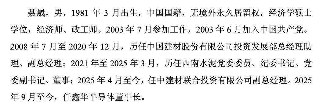 资料显示,聂崴,男,1981年3月出生,中国国籍,无境外永久居留权,经济学硕士学位,经济师、政工师。2003年7月参加工作。2008年7月至2020年12月,历任中国建材股份有限公司投资发展部总经理助理、副总经理;2021年至2025年3月,历任西南水泥党委委员、纪委书记、党委副书记、董事;2025年4月至今,任中建材联合投资有限公司副总经理。2025年9月至今,任鑫华半导体董事长。