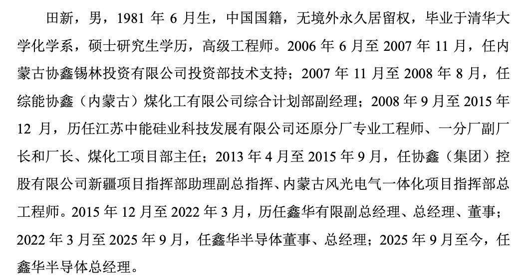 田新,男,1981年6月生,中国国籍,无境外永久居留权,毕业于清华大学化学系,硕士研究生学历,高级工程师。2006年6月至2007年11月,任内蒙古协鑫锡林投资有限公司投资部技术支持;2007年11月至2008年8月,任综能协鑫(内蒙古)煤化工有限公司综合计划部副经理;2008年9月至2015年12月,历任江苏中能硅业科技发展有限公司还原分厂专业工程师、一分厂副厂长和厂长、煤化工项目部主任;2013年4月至2015年9月,任协鑫(集团)控股有限公司新疆项目指挥部助理副总指挥、内蒙古风光电气一体化项目指挥部总工程师。2015年12月至2022年3月,历任鑫华有限副总经理、总经理、董事;2022年3月至2025年9月,任鑫华半导体董事、总经理;2025年9月至今,任鑫华半导体总经理。