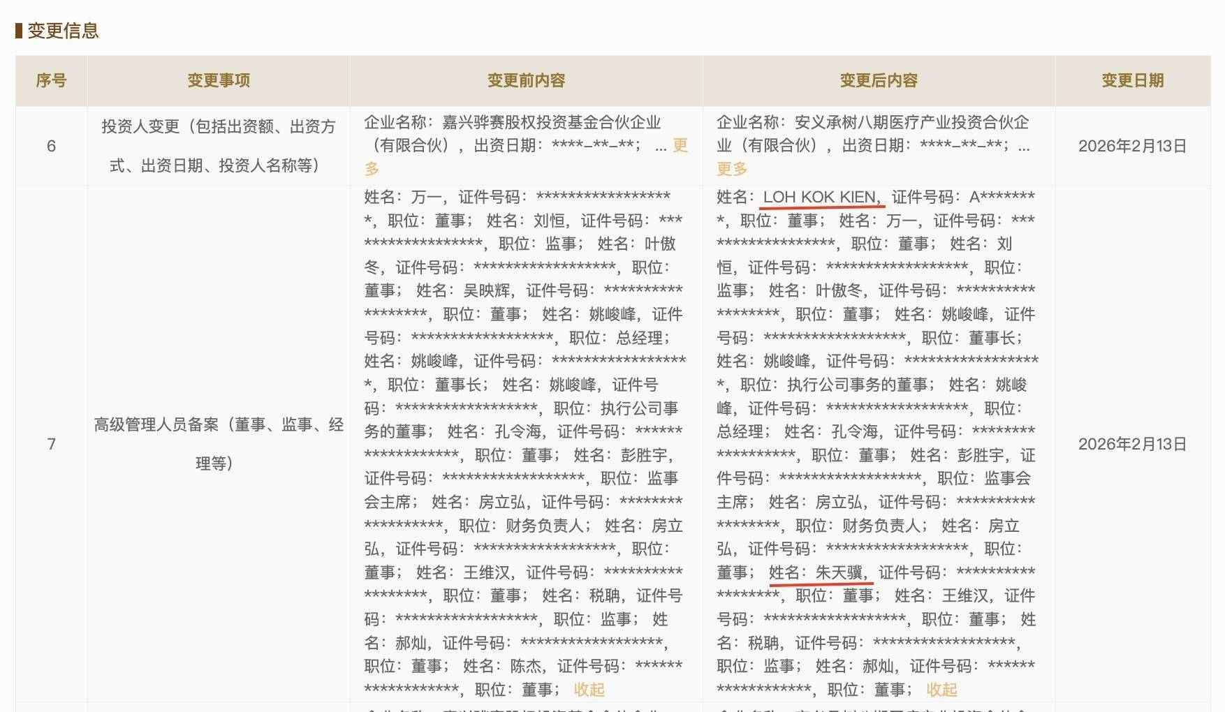 国家企业信用信息公示系统显示,目前,姚峻峰担任公司董事长、总经理、执行公司事务的董事。另外,董事陈杰、吴映辉退出,新进董事LOH KOK KIEN、朱天骥。