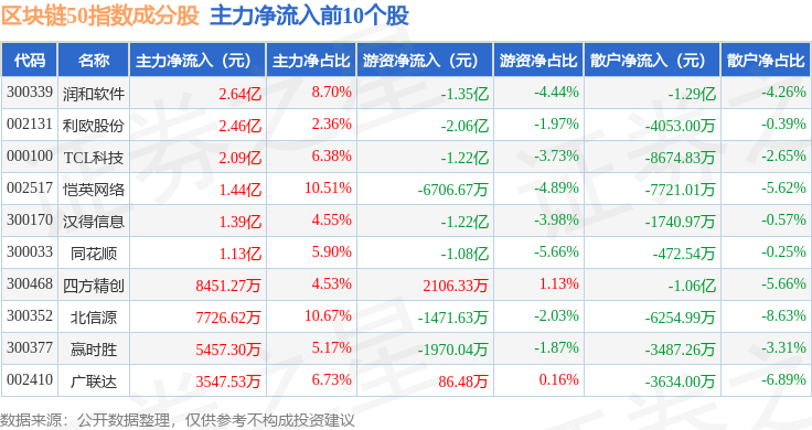 资金流向方面,区块链50(399286)指数成份股当日主力资金净流入合计5.74亿元,游资资金净流出合计8.72亿元,散户资金净流入合计2.98亿元。成份股资金流向详情见下表: