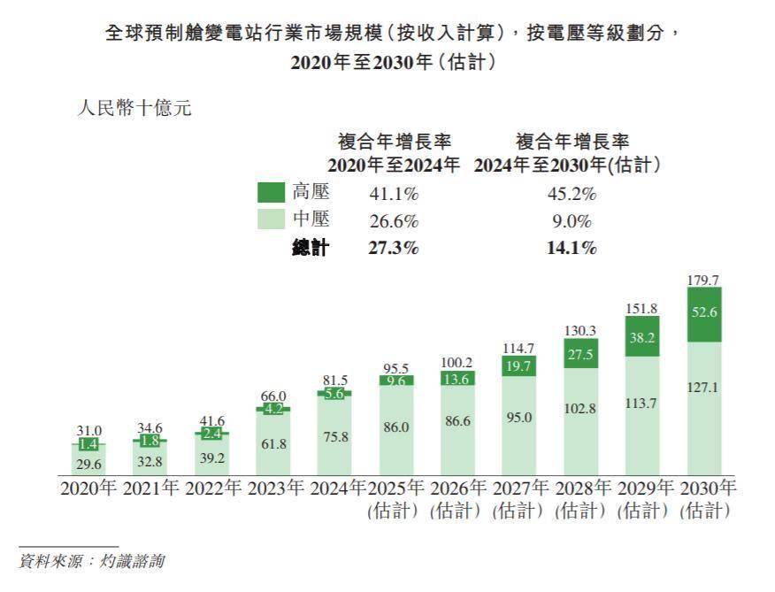 根据灼识谘询的资料,2020年全球预制舱变电站市场规模为310亿元,至2024年增长至815亿元,复合年增长率达27.3%。预计到2030年全球预制舱变电站市场规模将达到1797亿元,2024年至2030年复合年增长率为14.1%。此外,高压预制舱变电站作为支撑高压节点建设的关键设备,2024年市场规模为56亿元,预计到2030年将达到人526亿元,2024年至2030年复合年增长率为45.2%。