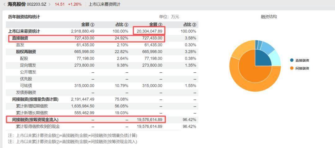 据Wind统计,自A股上市以来,海亮股份累计融资2030.4亿元,包括直接融资(首发、配股、定增、可转债)72.74亿元,间接融资(按筹资现金流入)1957.66亿元。