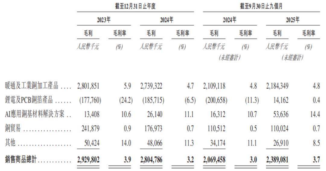 细分来看,暖通及工业铜加工产品毛利率分别为5.9%、4.7%及4.8%;锂电及PCB铜箔产品在2025年前9个月实现盈利,但毛利率仅有0.4%,此前2023年及2024年毛损率分别为24.2%、6.5%。