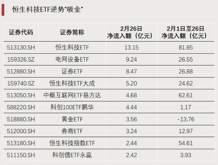 前一交易日(2月26日),ETF市场整体资金净流出超过290亿元。多只挂钩恒生科技指数的ETF显著“吸金”。