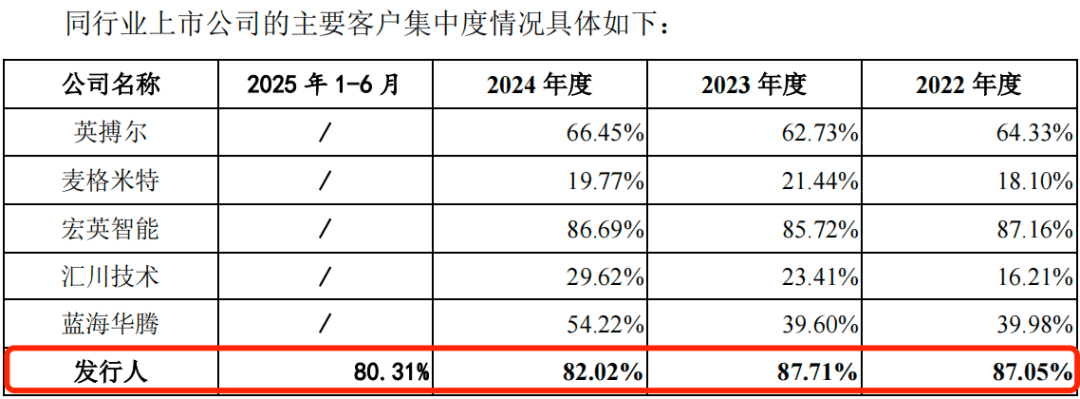 报告期内,公司向前五大客户的销售金额占营业收入的比例分别为87.05%、87.71%、82.02%和80.31%,客户集中度远高于多家同行业上市公司。