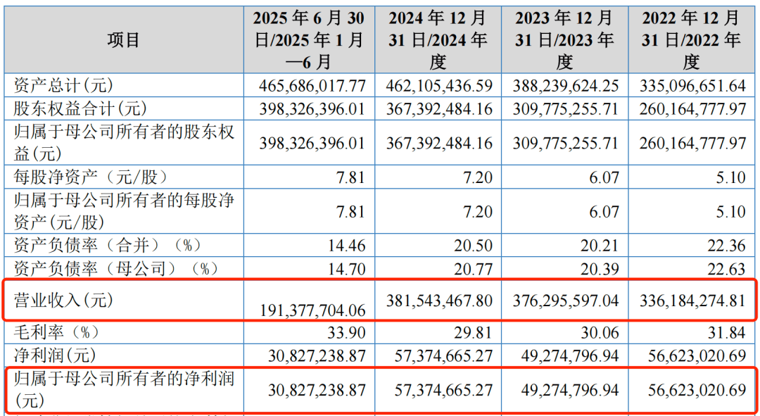 2022年至2025年上半年(以下简称“报告期”),嘉晨智能的营业收入分别为3.36亿元、3.76亿元、3.82亿元和1.91亿元;归母净利润分别为5662.30万元、4927.48万元、5737.47万元和3082.72万元,在2023年已经出现“增收不增利”的现象。
