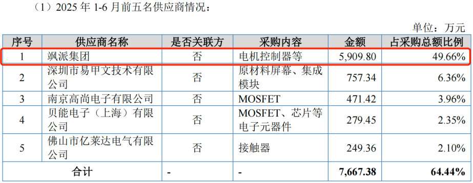 嘉晨智能对飒派集团的采购占比长期处于高位,叠加双方签订的采购“对赌”协议,进一步加深了供应链绑定程度。这使得公司在核心零部件供应上高度依赖单一供应商,独立经营能力或许存在一定隐忧。
