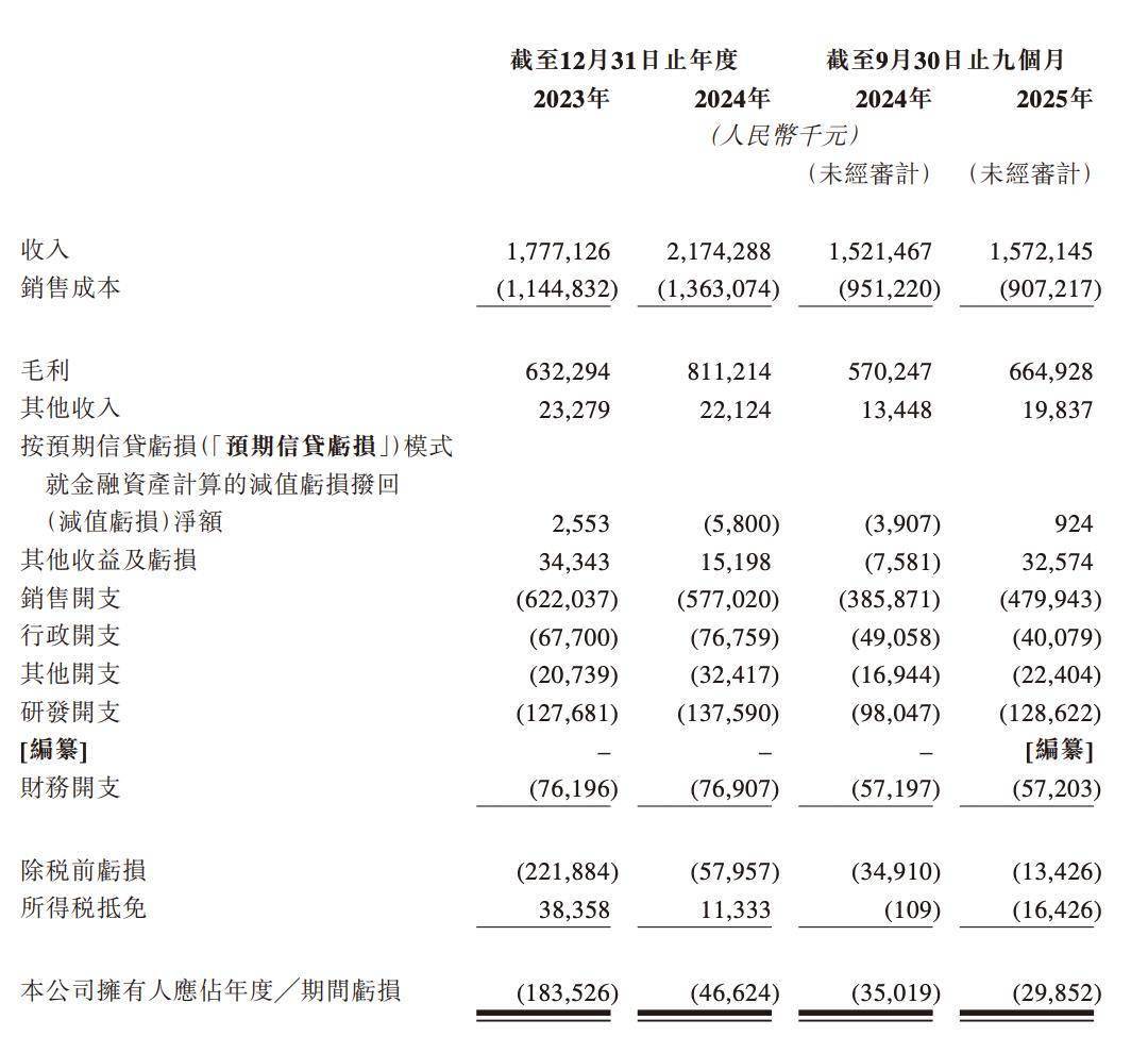 2023年、2024年及2025年前9月,德兰明海收入分别为17.77亿元、21.74亿元、15.72亿元,公司拥有人应占年度╱期间亏损分别为1.84亿元、4662.4万元、2985.2万元。