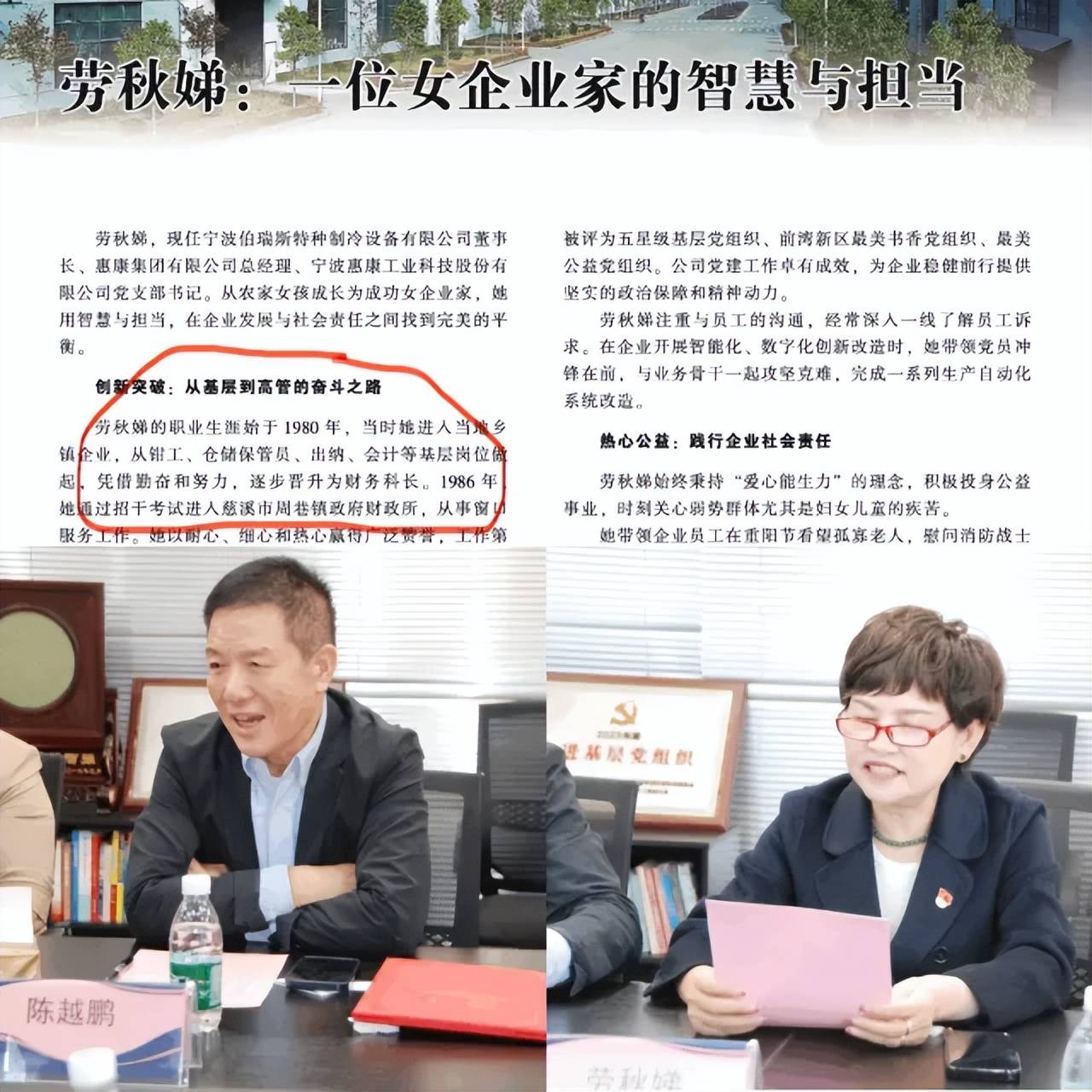 2025年5月,《宁波经济》刊发一篇报道,题为《劳秋娣:一位女企业家的智慧与担当》。当中记载了其从“钳工、仓储保管员、出纳、会计”到“招干进入镇财政所”,2003年下海进入惠康子公司,2021年升任惠康集团总经理的职业历程。