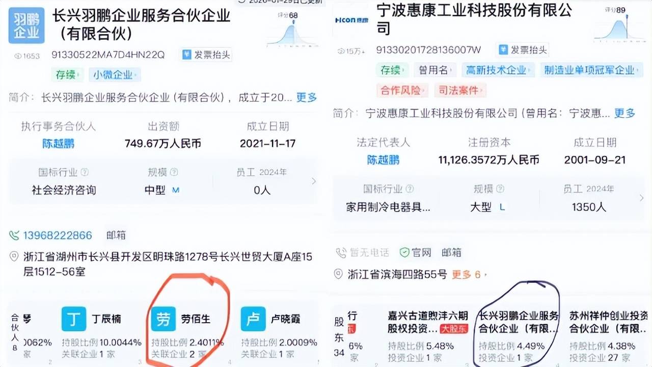 公开信息显示,劳佰生的实际职位包括:生产制造中心副总监、工会负责人、惠康科技关工委副主任,同时也是长兴羽鹏企业服务合伙企业(有限合伙)股东之一。