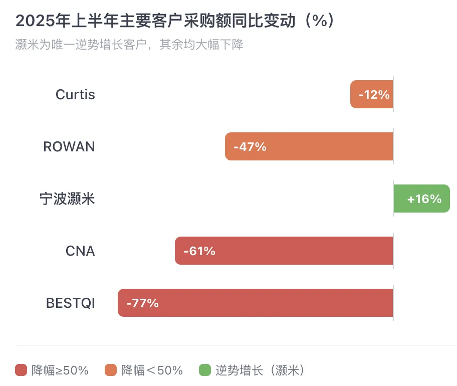 此种 “渠道代工”色彩下的客户结构,在2025年表现出巨大脆弱性:关税加征后,CNA采购额同比下降61%,BESTQI下降77%,ROWAN下降47%。