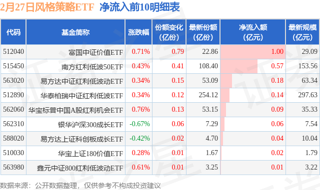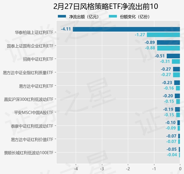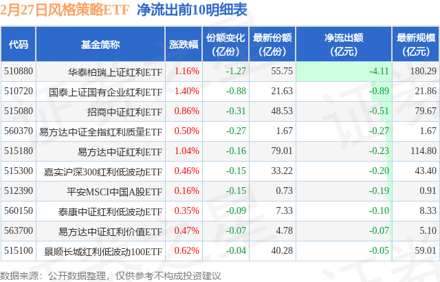 当日有17只风格策略ETF基金出现资金净流出,其中净流出排首位的是华泰柏瑞上证红利ETF(510880),份额减少了1.27亿份,净流出额为4.11亿元。