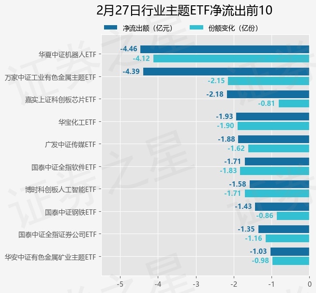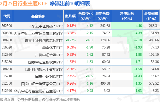 当日有147只行业主题ETF基金出现资金净流出,其中净流出排首位的是华夏中证机器人ETF(562500),份额减少了4.12亿份,净流出额为4.46亿元。