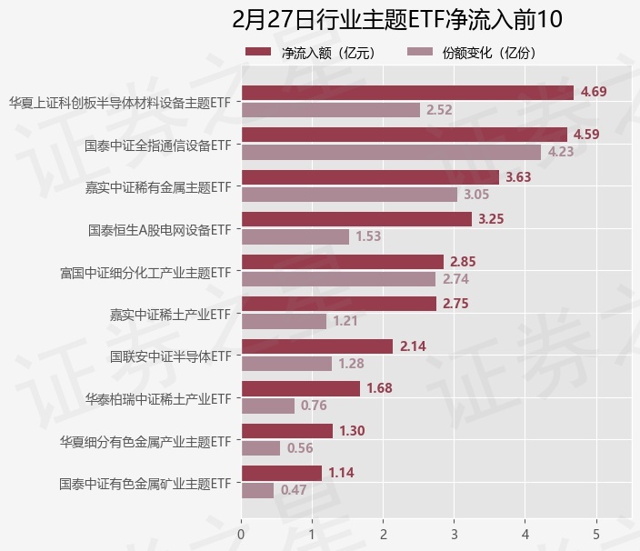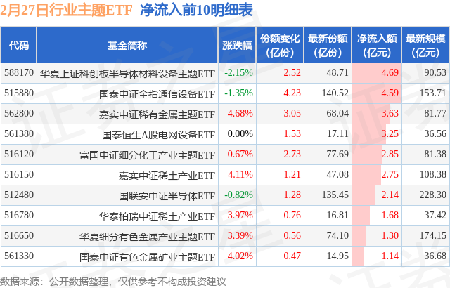 当日有97只行业主题ETF基金出现资金净流入,其中净流入排首位的是华夏上证科创板半导体材料设备主题ETF(588170),份额增加了2.52亿份,净流入额为4.69亿元。