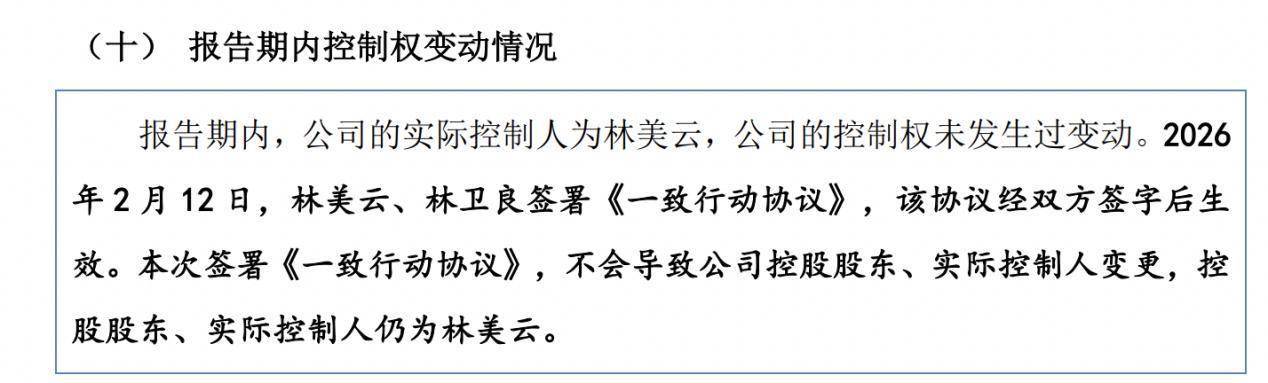 另外,公司第四大股东林卫良持股比例为3.48%,为林美云胞弟,也是公司员工。2026年2月12日,林美云、林卫良签署《一致行动协议》,该协议经双方签字后生效。