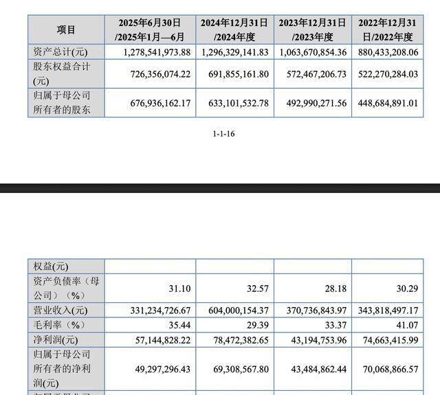 2022年-2024年及2025年上半年,龙辰科技营业收入分别为3.44亿元、3.71亿元、6.04亿元、3.31亿元,归母净利润分别为7006.89万元、4348.49万元、6930.86万元、4929.73万元,毛利率分别为41.07%、33.37%、29.39%、35.44%。