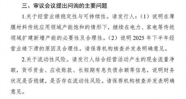 审议会议上,北交所要求龙辰科技:说明在薄膜材料传统应用领域产能饱和的情形下,继续在电力、家电等传统领域扩建新增产能的必要性及合理性。说明2025年下半年经营业绩下滑的原因及合理性。