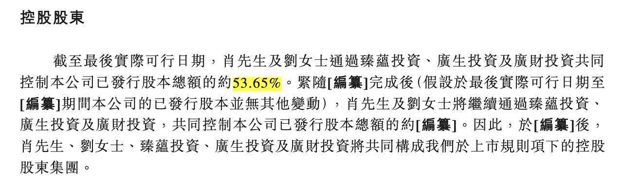 IPO前,肖红星及刘锦婵通过臻蕴投资、广生投资及广财投资共同控制公司已发行股本总额的约53.65%。因此,肖红星、刘锦婵、臻蕴投资、广生投资及广财投资将共同构成公司于上市规则项下的控股股东集团。
