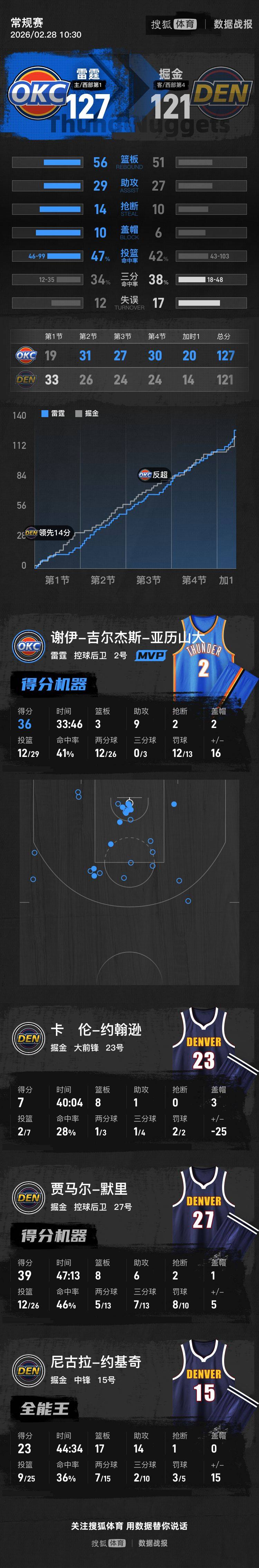 【搜狐体育战报】北京时间2月28日NBA常规赛,主场作战的雷霆以127-121加时击败掘金。霍姆格伦15分21篮板3助攻,约基奇23分17篮板14助攻。