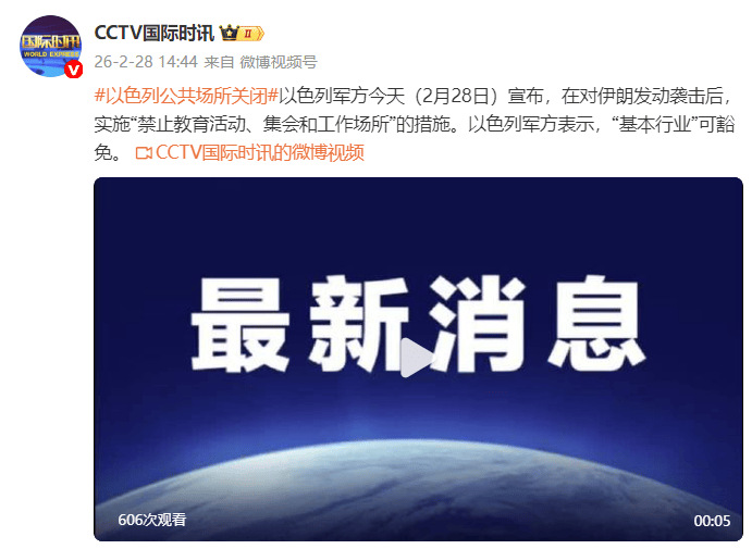 以色列军方今天(2月28日)宣布,在对伊朗发动袭击后,实施“禁止教育活动、集会和工作场所”的措施。以色列军方表示,“基本行业”可豁免。