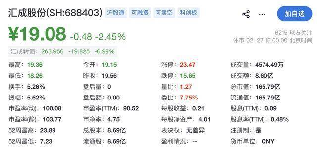 截至发稿时,汇成股份报19.08元,总市值约165.79亿元。