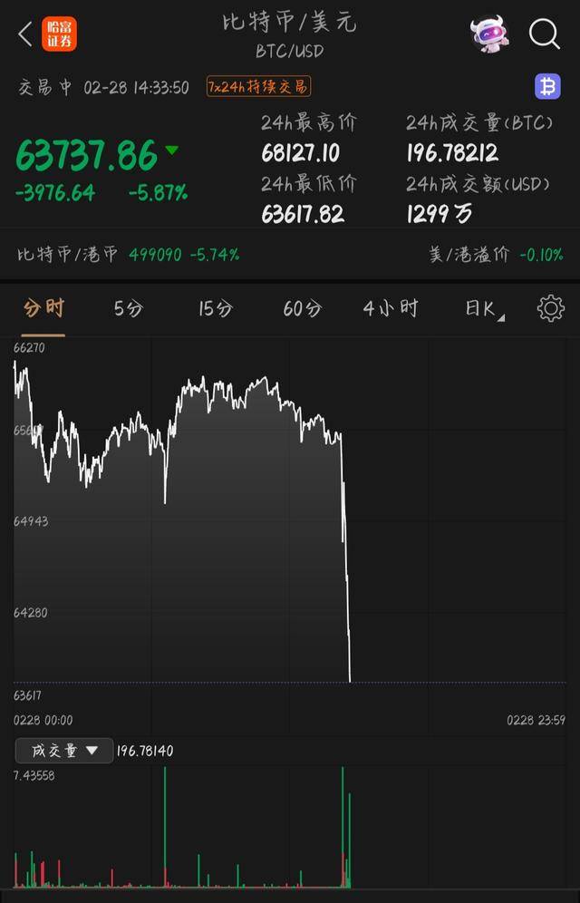 2月28日,比特币快速下挫3976.64美元,日内跌近6%,现报63737.86美元。
