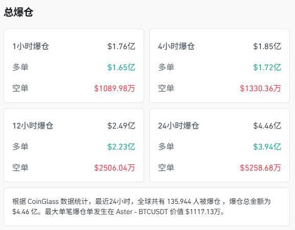 根据CoinGlass数据统计,最近24小时,全球共有13.5万人被爆仓 ,爆仓总金额为4.46亿美元。