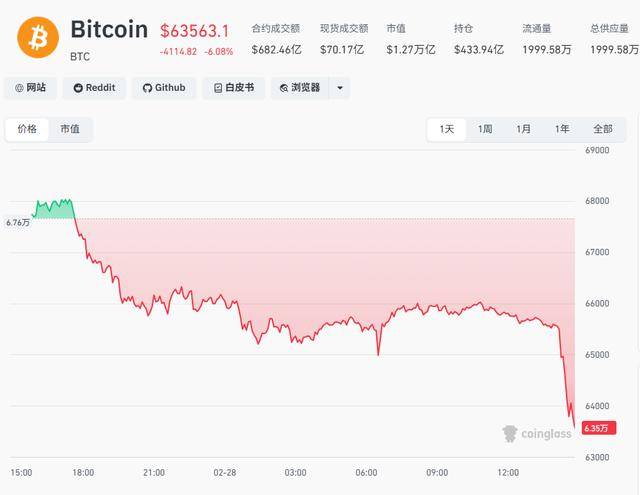 2月28日下午,受以色列袭击伊朗消息影响,比特币急跌,四小时内跌近3%,截至14:52,24小时内跌超6%,跌破64000美元。以太币跌8.49%,索尔币跌近10%。狗狗币、HYPE等多个品种同步重挫。