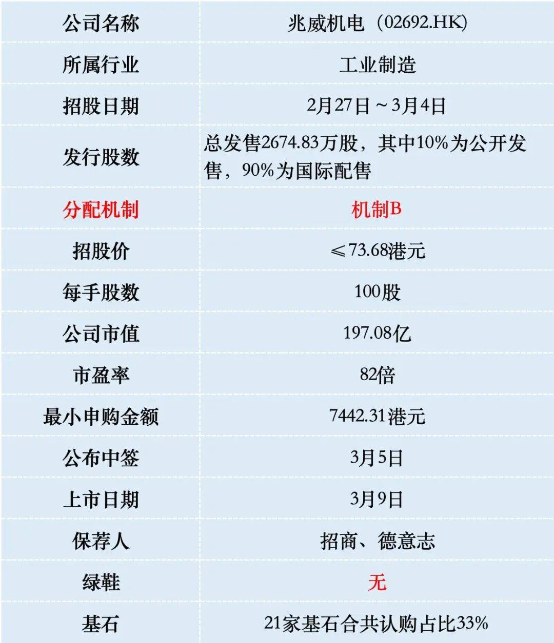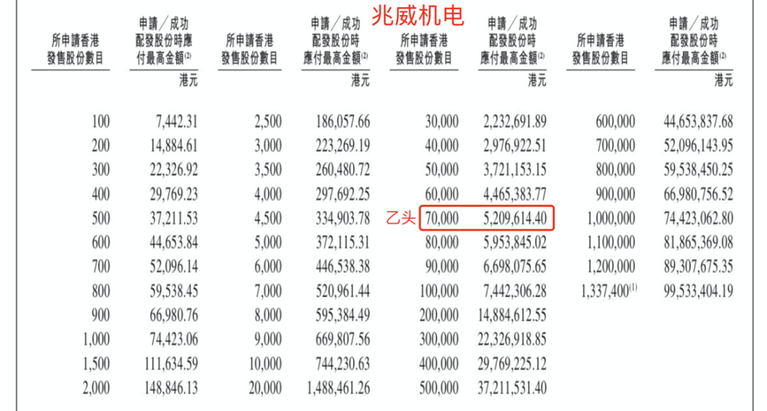 兆威机电目前孖展61倍,最终大概率会超购600倍,甲乙组各13375手。申购人数按照12万人算,预估一手中签率5%,甲组全部抽签。