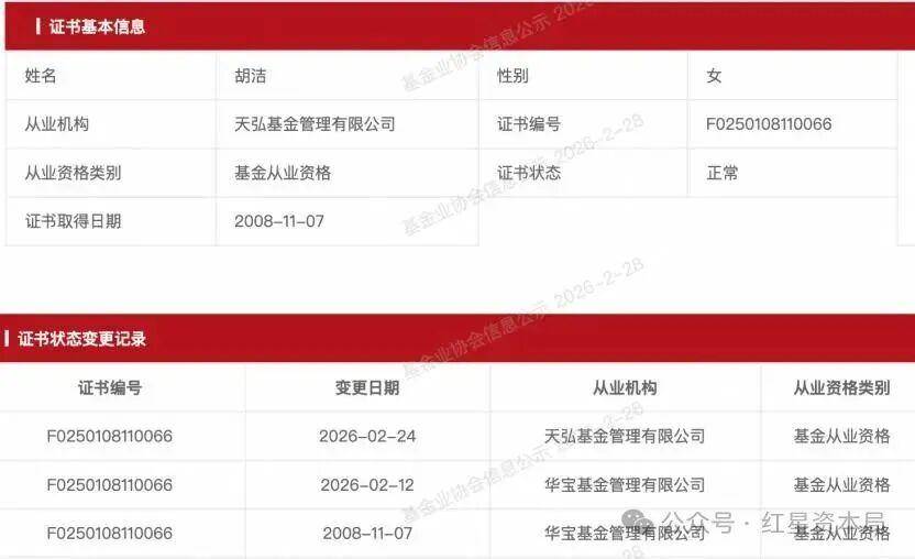 2月28日,记者查阅中国证券投资基金业协会公示信息发现,胡洁已于2月12日从华宝基金完成注销,并于2月24日完成从业机构变更,正式加盟天弘基金。