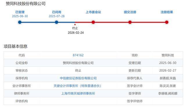 2025年6月30日,赞同科技申报北交所IPO获得受理,7月28日公布首轮问询函但一直未回复。如今公司终止IPO无功而返,成为2026年第二家终止北交所上市审核的企业。