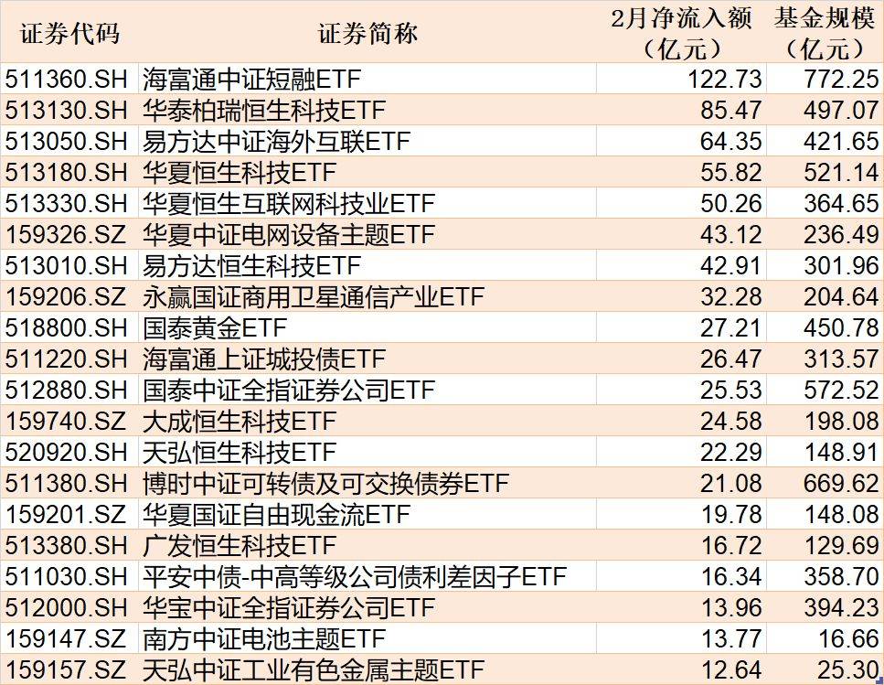 截至2月27日,2月资金净流入额居前20的ETF名单如下: