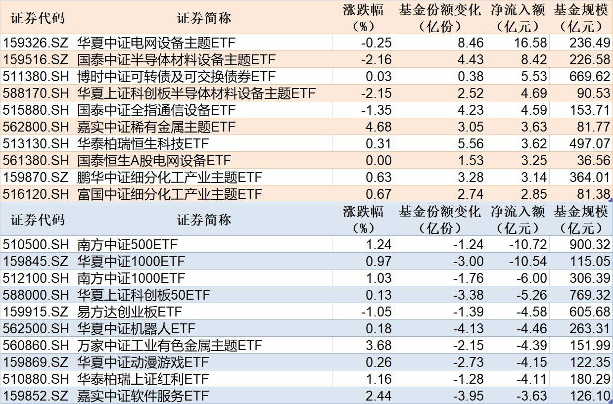 与此同时,南方中证500ETF基金份额减少1.24亿份,净流出额10.72亿元;华夏中证1000ETF基金份额减少3.00亿份,净流出额10.54亿元;南方中证1000ETF基金份额减少1.76亿份,净流出额6.00亿元。