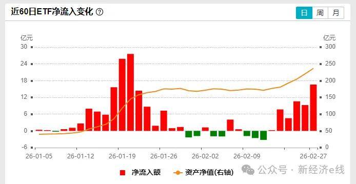 回到A股市场,“HALO资产”的爆发始于2026年2月中下旬,具体表现为相关ETF规模创新高、资金持续净流入及标的指数大幅上涨。