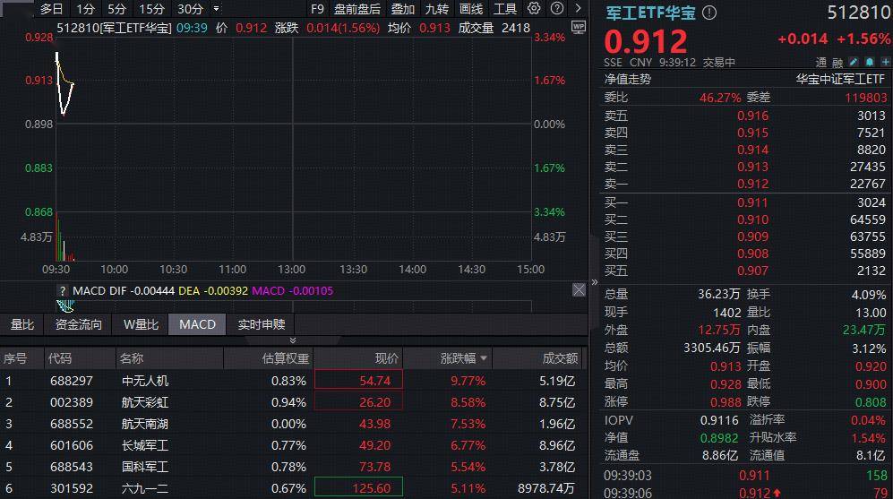 中东大变局影响,3月2日,A股军工板块跳空高开!高人气军工ETF华宝(512810)高开逾3%,而后受大市情绪影响有所回落,截至发稿涨1.56%。成份股方面,中无人机领涨超9%,航天彩虹涨超8%,航天南湖、长城军工大幅跟涨。