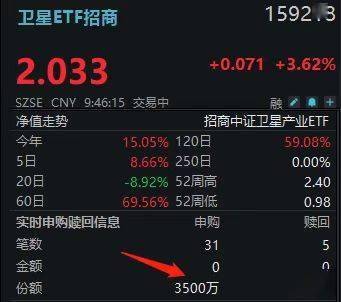 3月2日早盘,卫星产业链延续史诗级行情。截至9时46分,卫星ETF招商(159218)放量大涨3.47%,强势冲击日线四连升。权重股中国卫星更是狂飙8.18%,领涨板块。资金抢筹态势愈发疯狂——该ETF连续4日获净流入,累计吸金超3.5亿元,盘中再添6000万弹药。年内份额已暴增180.60%,数字背后是全球资本正以前所未有的共识向太空“下注”。