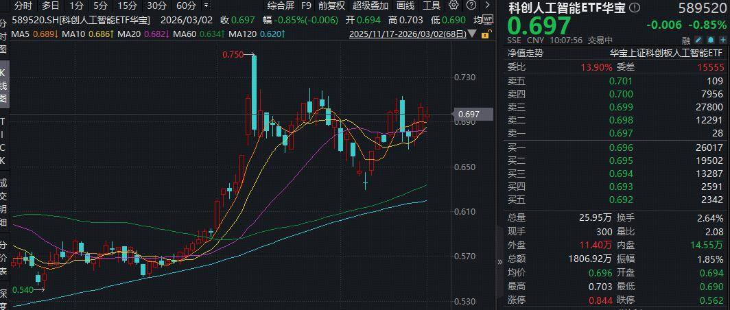 或由于美伊地缘事件扰动,科技方向短期情绪受冲击,3月2日,重点布局国产AI产业链的科创人工智能ETF(589520)场内价格在水面下震荡,场内价格现跌0.85%,但当前仍在所有均线上方,冲击日线3连阳!