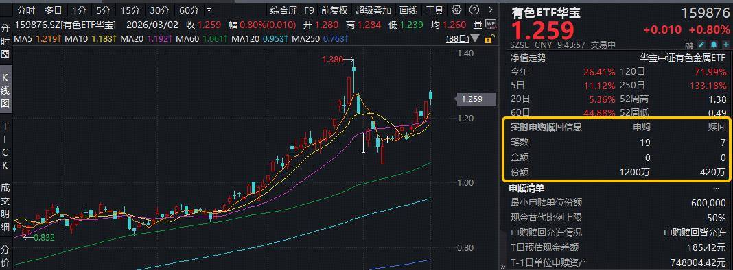 或由于美伊地缘事件催化,3月2日,现货黄金冲击日线4连阳,重返5300美元/盎司上方,揽尽有色金属行业龙头的有色ETF(159876)逆市活跃,场内价格盘中涨超1.2%,现涨0.8%,截至发稿,获资金实时净申购780万份!