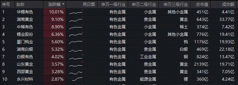 成份股方面,华锡有色盘中触及涨停,股价创历史新高!湖南黄金涨超9%,中稀有色涨逾8%,锡业股份、厦门钨业、湖南白银、白银有色等个股跟涨。