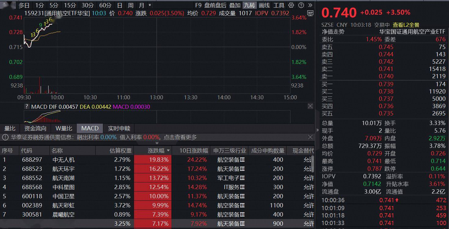 3月2日早盘,航空航天延续强势,中无人机、航天南湖双双涨逾10%,航天彩虹强势涨停,中科星图、中国卫星涨超8%。一键布局商业航天+卫星导航+低空经济+大飞机的通用航空ETF华宝(159231)场内价格开盘后直线拉升,现涨3.5%,冲击七连阳!