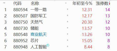 概念板块方面,一带一路、商业航天、国防军工、无人机、天然气等板块领涨,其中一带一路录得14个涨停板,国防军工13个涨停,天然气12个涨停。