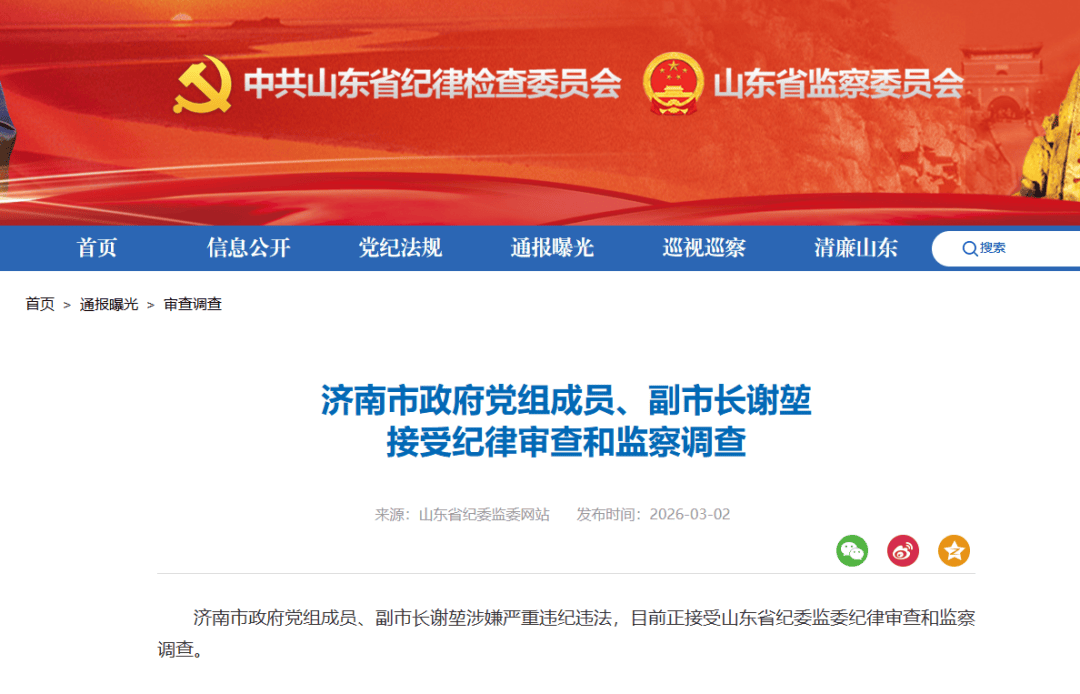济南市政府党组成员、副市长谢堃涉嫌严重违纪违法,目前正接受山东省纪委监委纪律审查和监察调查。