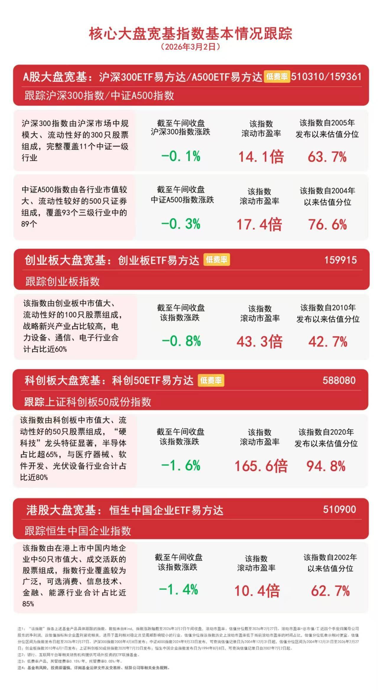 截至午间收盘,中证A500指数下跌0.3%,沪深300指数下跌0.1%,创业板指数下跌0.8%,上证科创板50成份指数下跌1.6%,恒生中国企业指数下跌1.4%。