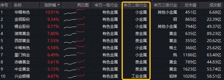 消息面上,华锡有色涨停,金钼股份涨超9%,锡业股份涨逾8%,湖南黄金、西部黄金涨超7%,中稀有色、厦门钨业、赤峰黄金、中金黄金等个股跟涨。
