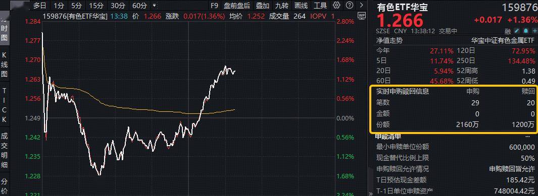 3月2日,揽尽有色金属行业龙头的有色ETF(159876)午后快速拉升,场内价格盘中拉升1.5%,现涨1.36%,实时成交额1.33亿元,交投火热!截至发稿,获资金实时净申购960万份。