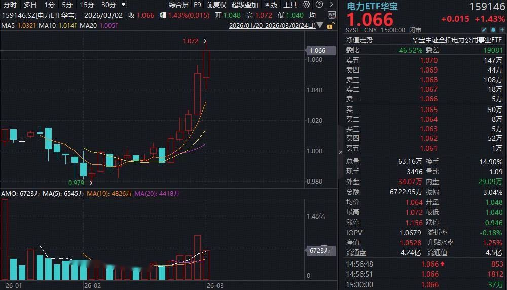 热门ETF方面,“HALO”核心资产——电力ETF华宝(159146)场内收涨1.43%再创新高,日线斩获五连阳,全天成交超6700万元,交投持续活跃。