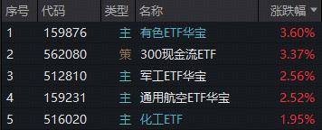盘面上,或由于地缘冲突催化,现货黄金站上5400美元/盎司,揽尽有色金属行业龙头的有色ETF(159876)午后走高,场内价格强势拉升3.6%;主力资金大举扫货军工板块,军工核心资产——军工ETF华宝(512810)盘中上探3.34%、通用航空ETF华宝(159231)场内收涨2.52%;石油、化工应声走强,重仓石油石化+基础化工板块的化工ETF(516020)场内收涨1.95%。