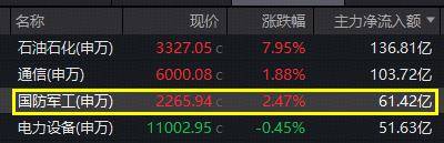 地缘政治风险加剧,A股军工板块果然崛起,主力资金大举扫货,全天净买入国防军工超61亿元,排名申万全行业第三,仅次于石油石化和通信。