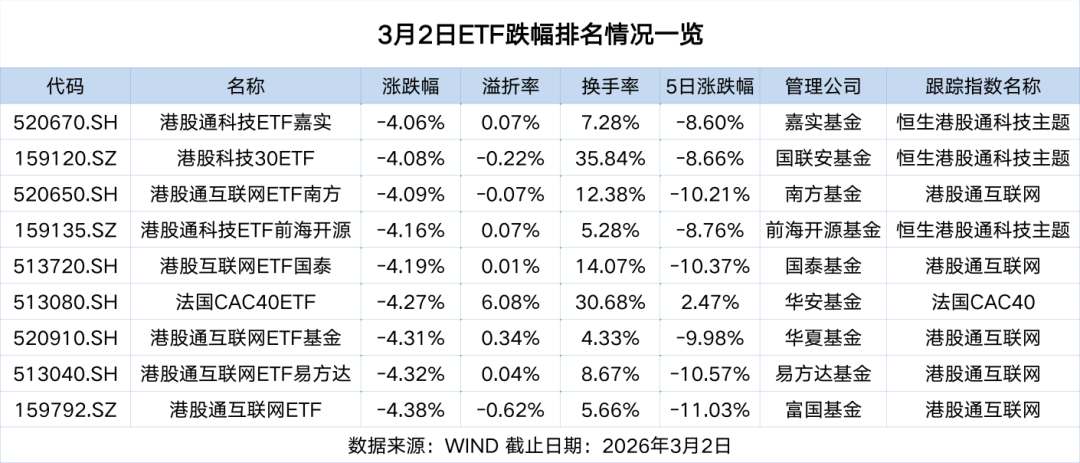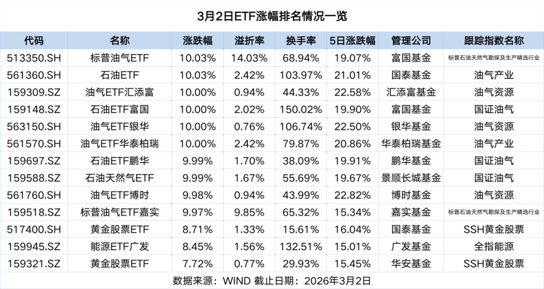 值得注意的是,除油气ETF外,3月2日黄金ETF、卫星ETF、有色ETF等避险及资源类ETF亦同步涨幅居前,市场避险情绪与资源品交易热度并存。
