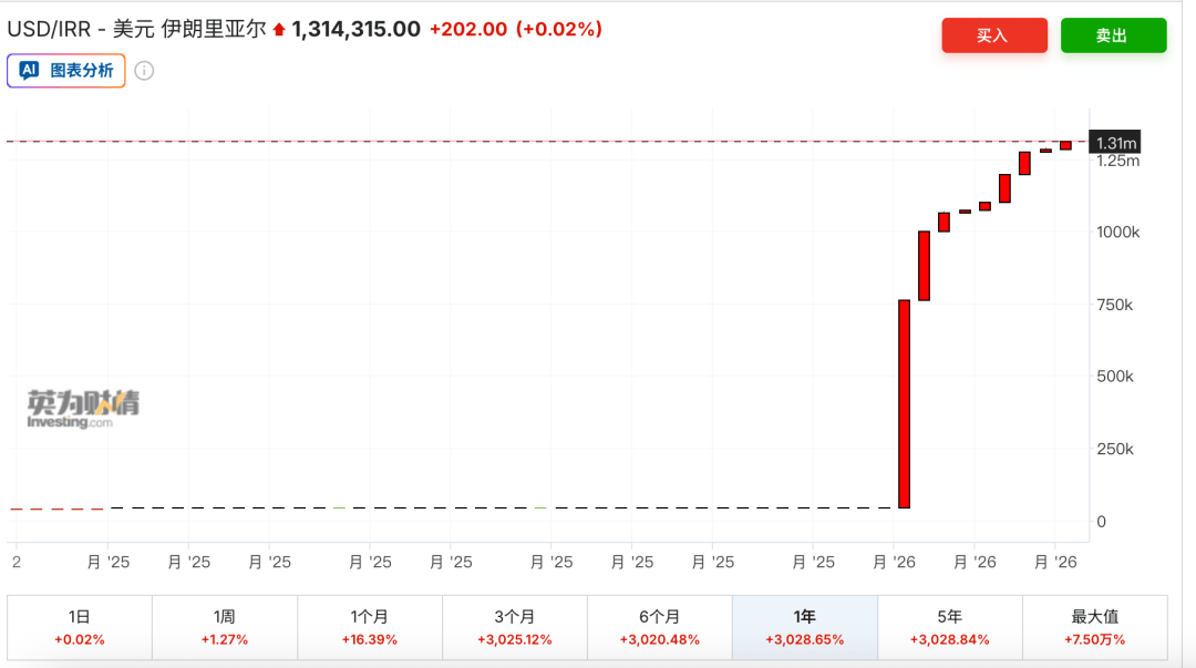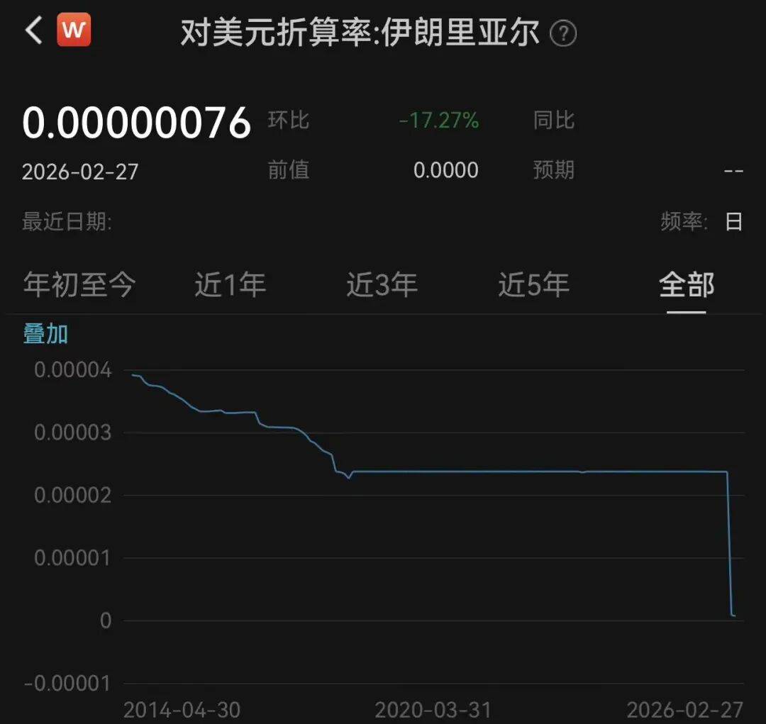而在一个多月前的1月30日,1美元尚可兑换108.7万里亚尔。再往前追溯至2025年12月,折算率还维持在1美元可兑换4.2万里亚尔的水平。短短两个月内,美元兑伊朗里亚尔汇率跌超3000%。